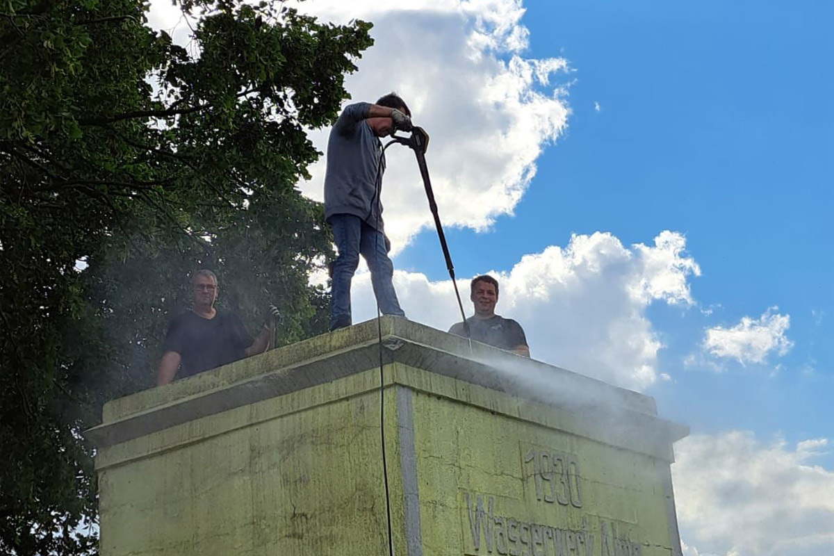 Heute, 35 Jahre später, war es wieder an der Zeit, sich um den Hochbehälter zu kümmern. Einige Ludgerusschützen unter der kundigen Leitung von Hans-Alfred Schröder, seines Zeichens Restaurator, befreiten das Grundstück von Unkraut und Gestrüpp und säuberten die Mauern, um erstmal den Zustand zu ermitteln. Tja, der er war nicht rosig! Risse, Durchrostungen, Abplatzungen der Verputzung waren reichlich vorhanden. Hans-Alfred erstellte eine Liste benötigter Baumittel und an einigen Wochenenden werkelten die Schützen aus Oberlame am Gebäude, bis es wie „Neu“ aussah. Damit auch die Stahltür ohne Probleme geöffnet werden kann, wurde die Zuwegung begradigt. In den Wintermonaten wird sich unser Oberst Heiner Hillebrand noch um diese Tür kümmern, auch hier hat der Rost zugeschlagen.